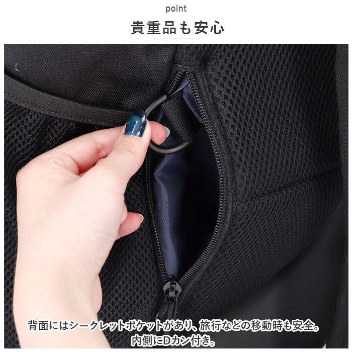 ・背面にはシークレットポケットがあり、旅行などの移動時も安全。内側にDカン付き。