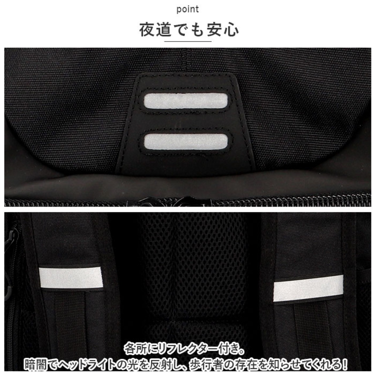 ・各所にリフレクター付き。暗闇でヘッドライトの光を反射し、歩行者の存在を知らせてくれる!