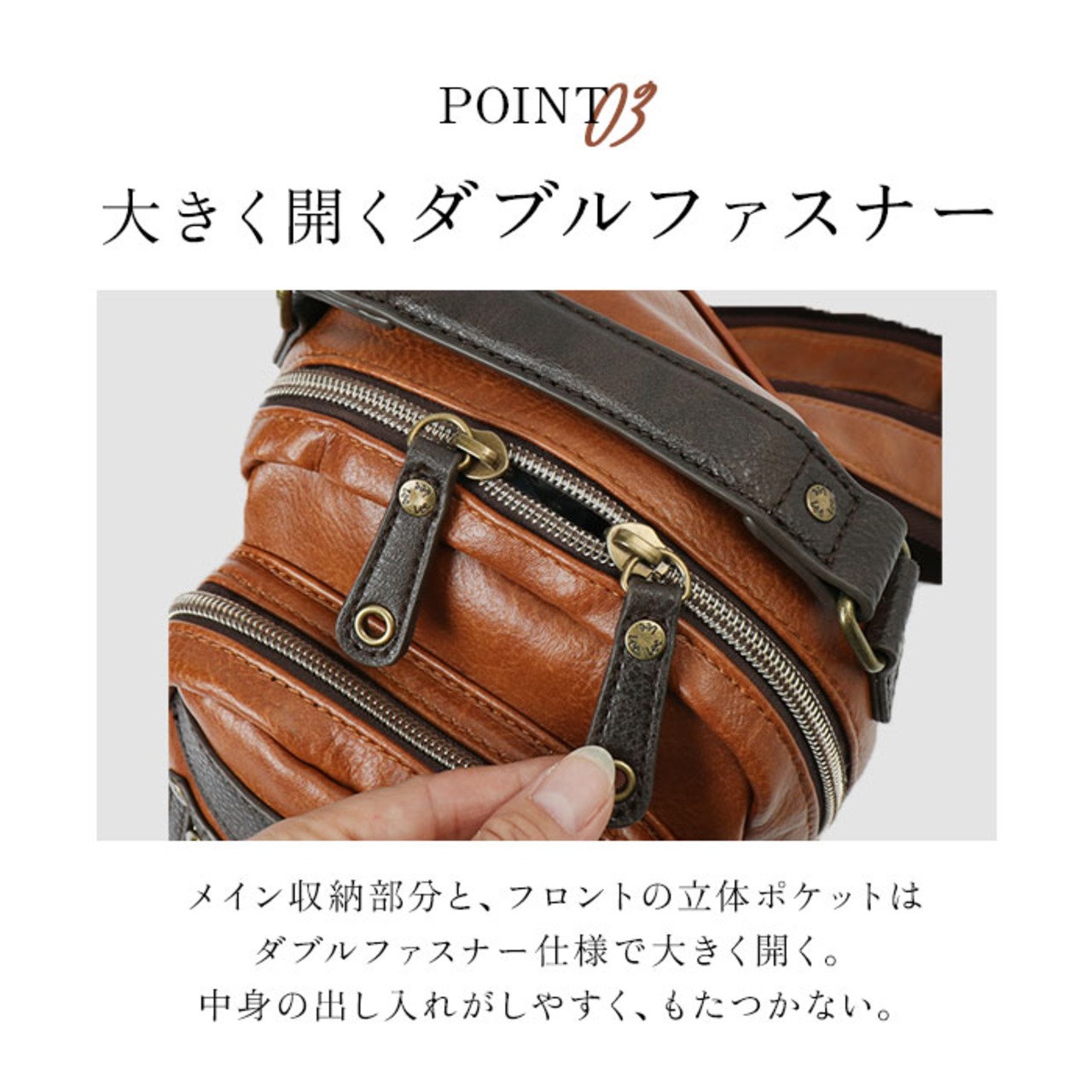 ・メイン収納のファスナーはダブル仕様。必要な物を取り出しやすく使いやすい◎