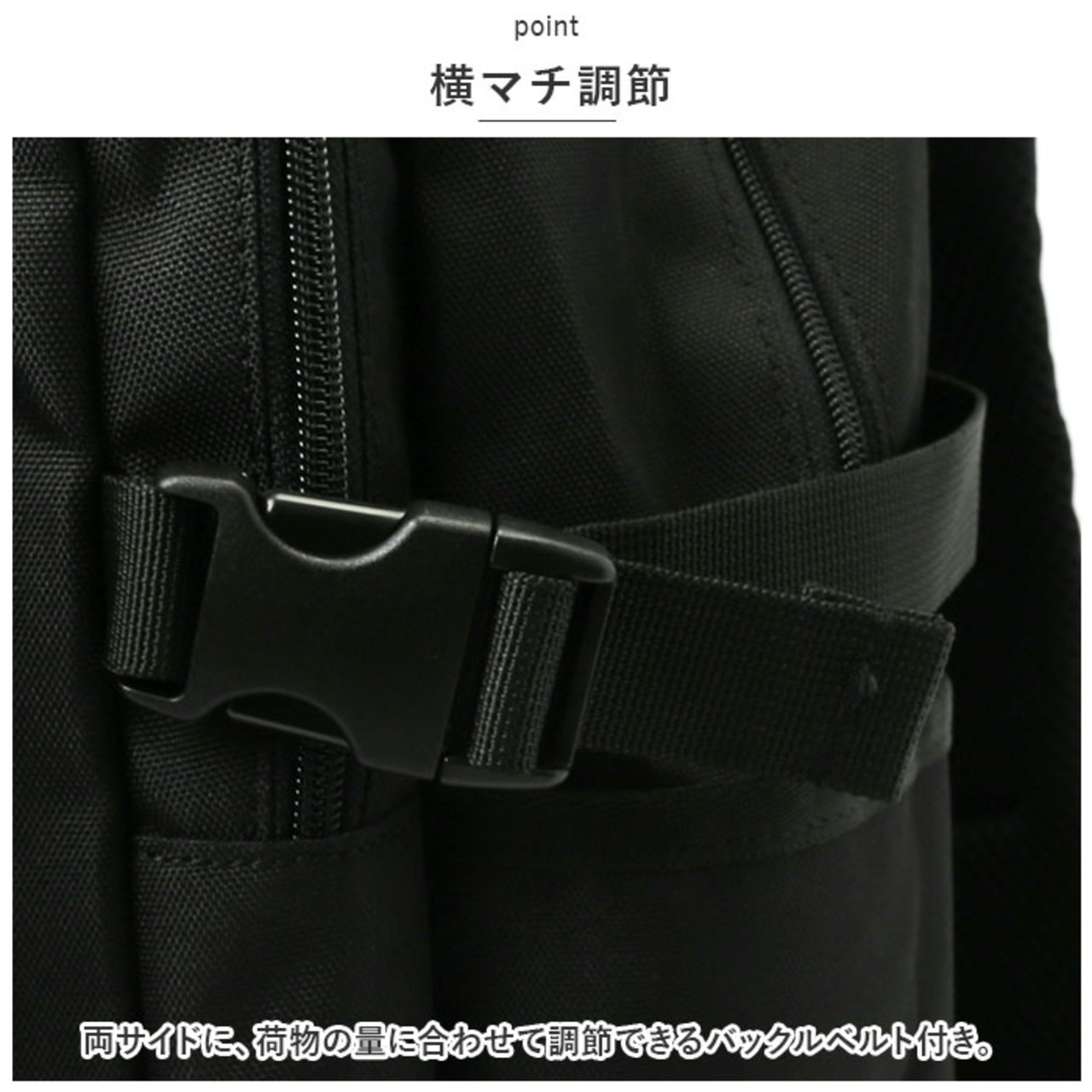 ・両サイドに、荷物の量に合わせて調節できるバックルベルト付き。