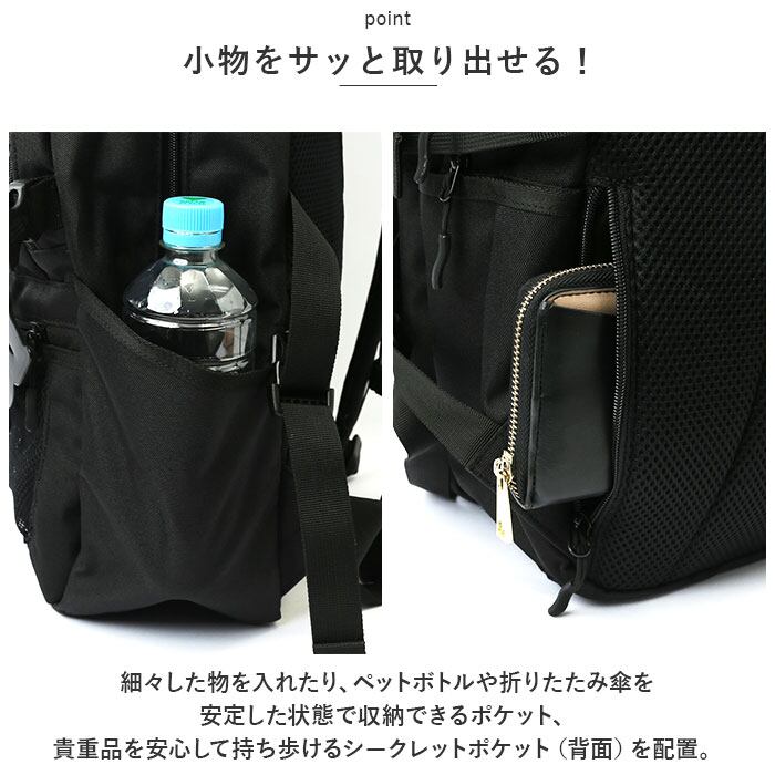 ・細々した物を入れたり、ペットボトルや折りたたみ傘を安定した状態で収納できるポケット、貴重品を安心して持ち歩けるシークレットポケット(背面)を配置。