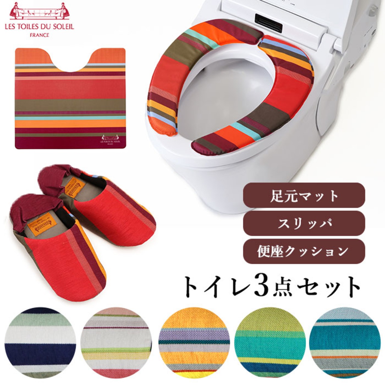 トイレマット セット おしゃれ 通販 トイレ3点セット 足元マット 便座クッション 便座シート トイレスリッパ インテリア トイレファブリック 新築祝い ギフト お手入れ簡単 防カビ 防炎 抗菌 防臭 撥水 はっ水 ストライプ PVC 塩化ビニル樹脂 フランス ブランド