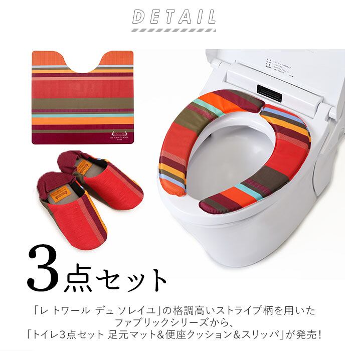・「レ トワール デュ ソレイユ」の格調高いストライプ柄を用いたファブリックシリーズから、「トイレ3点セット 足元マット&便座クッション&スリッパ」が発売。