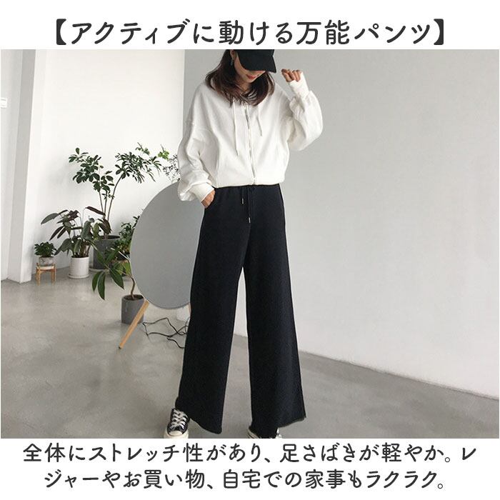・ウエストは幅広ゴムと紐で締め付け感なし!伸縮性のあるスウェット素材でのびのびラクラク。