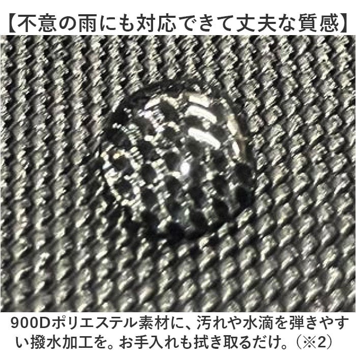 ・900Dポリエステル素材に、汚れや水滴を弾きやすい撥水加工を。お手入れも拭き取るだけ。