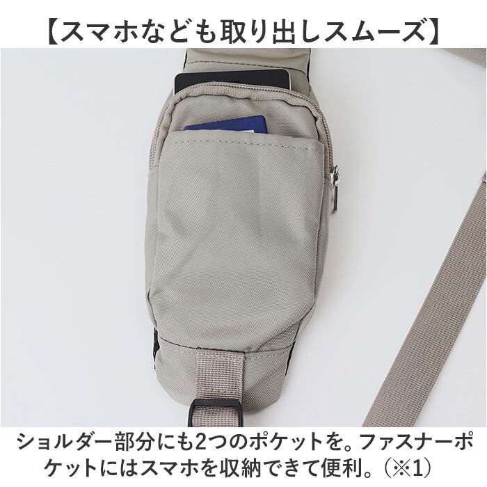 ・ショルダー部分にも2つのポケットを。ファスナーポケットにはスマホを収納できて便利。