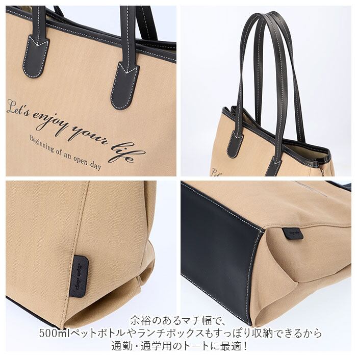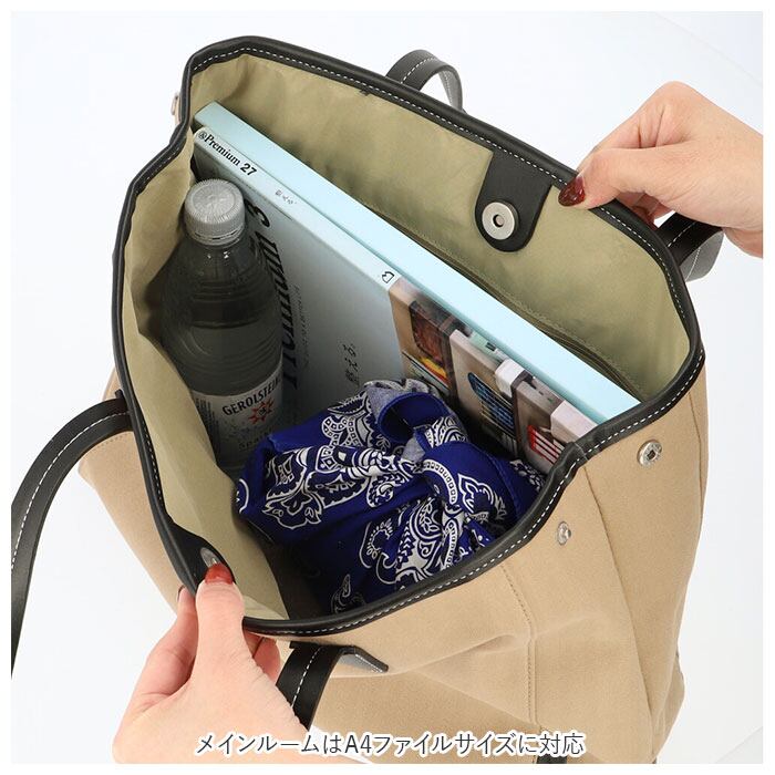 ・メインルームはA4ファイルサイズに対応。余裕のあるマチ幅で、500mlペットボトルやランチボックスもすっぽり収納できるから通勤・通学用のトートに最適!