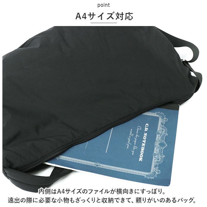 ・内側はA4サイズのファイルが横向きにすっぽり。遠出の際に必要な小物もざっくりと収納できて、頼りがいのあるバッグ。