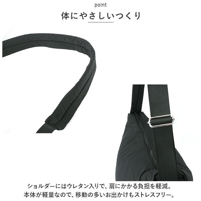 ・ショルダーにはウレタン入りで、肩にかかる負担を軽減。本体が軽量なので、移動の多いお出かけもストレスフリー。