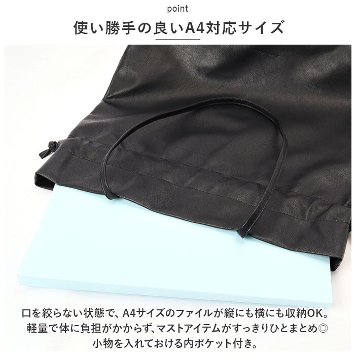 ・口を絞らない状態で、A4サイズのファイルが縦にも横にも収納OK。軽量で体に負担がかからず、マストアイテムがすっきりひとまとめ◎小物を入れておける内ポケット付き。