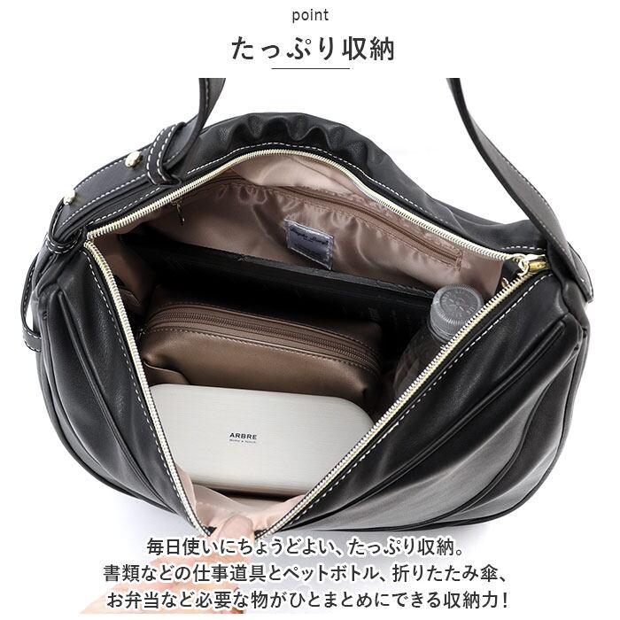 ・毎日使いにちょうどよい、たっぷり収納。書類などの仕事道具とペットボトル、折りたたみ傘、お弁当など必要な物がひとまとめにできる収納力!