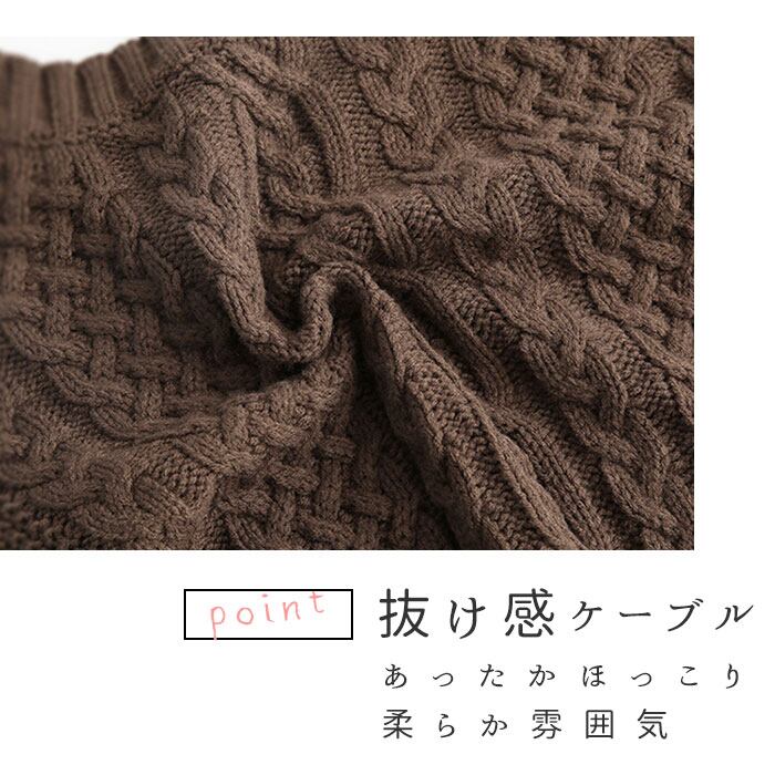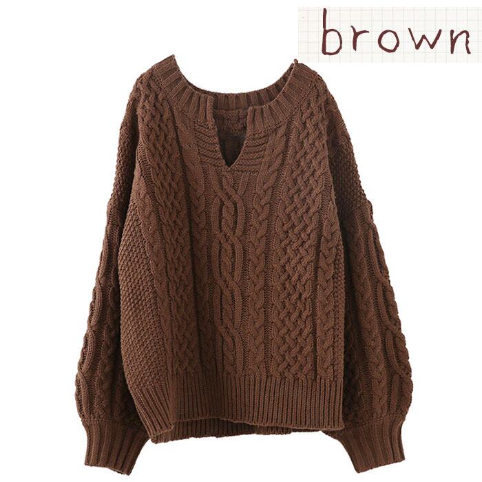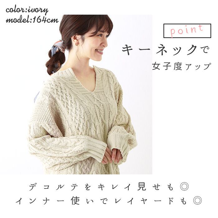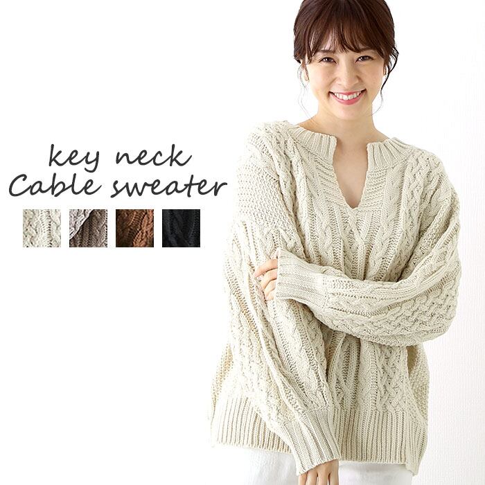 ・ざっくりと立体的なケーブル編みが可愛い♪ゆったりサイズのキーネックニットセーター。