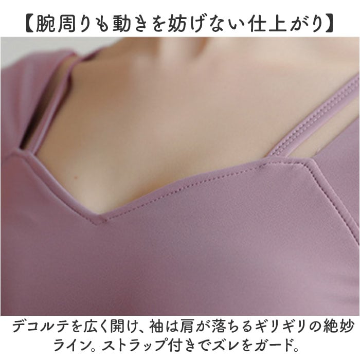 ・デコルテを広く開け、袖は肩が落ちるギリギリの絶妙ライン。ストラップ付きでズレをガード。