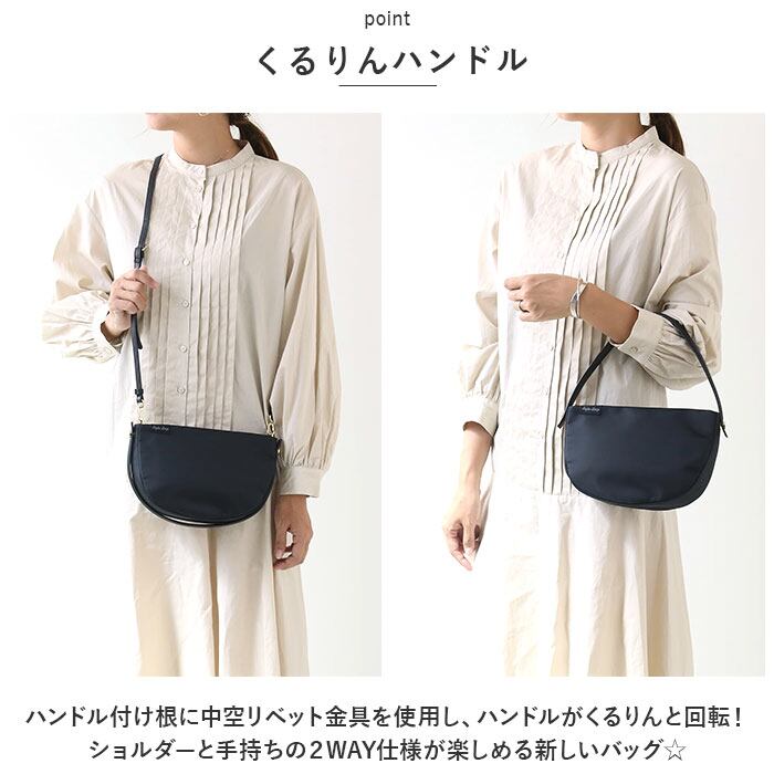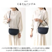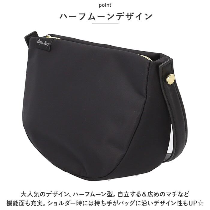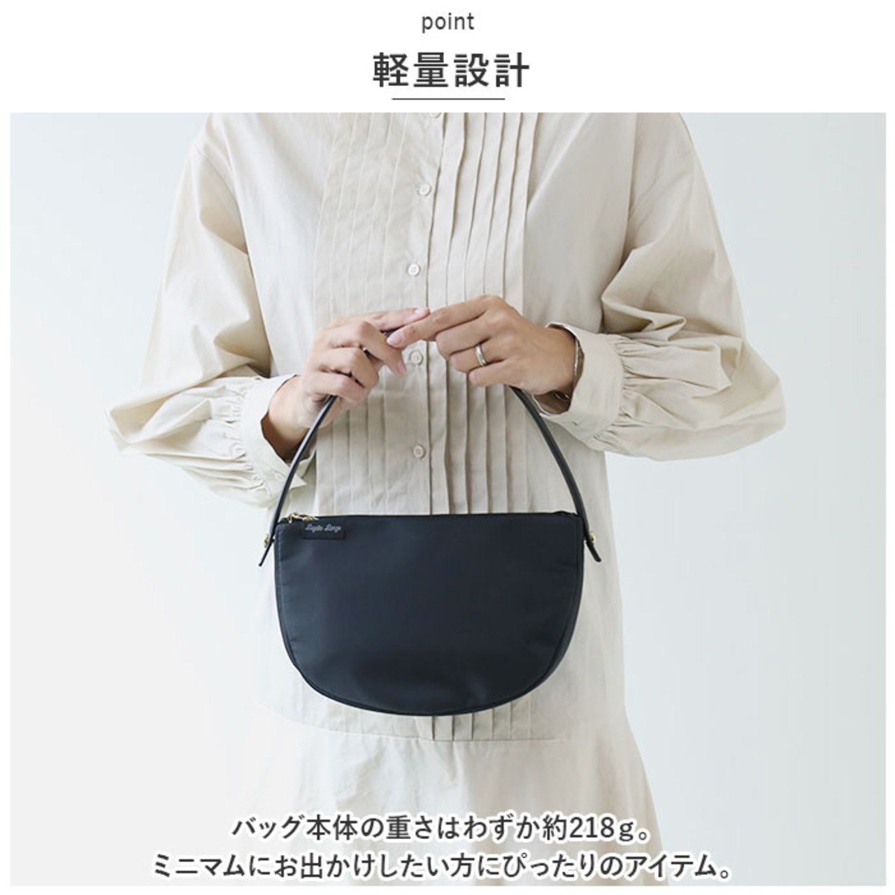 ・大人気のデザイン、ハーフムーン型。自立する&広めのマチなど機能面も充実。ショルダー時には持ち手がバッグに沿い、デザイン性もUP☆