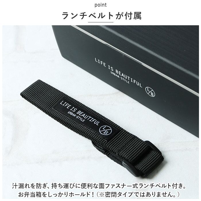 ・汁漏れを防ぎ、持ち運びに便利な面ファスナー式ランチベルト付き。お弁当箱をしっかりホールド!(※密閉タイプではありません。)