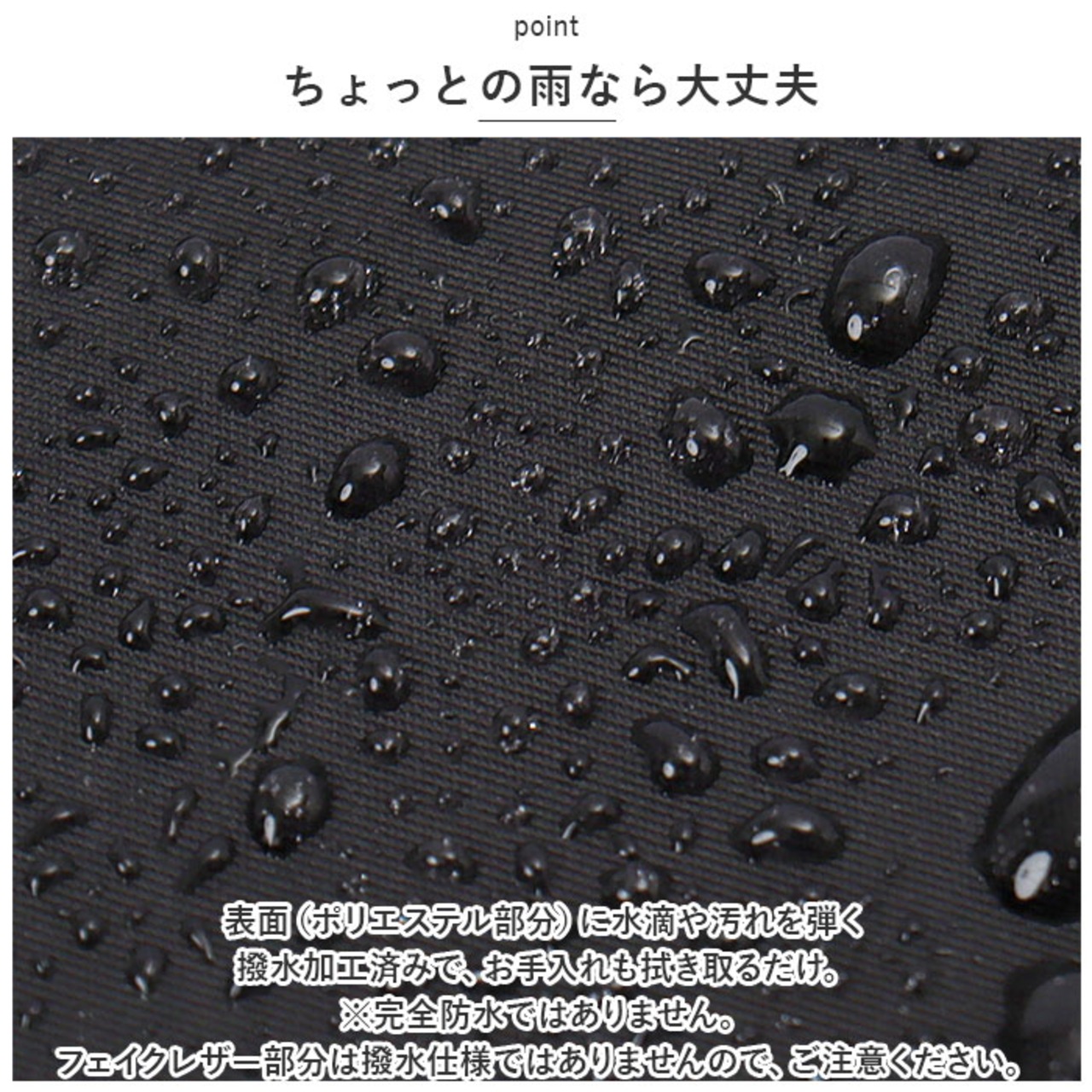 ・表面(ポリエステル部分)に水滴や汚れを弾く撥水加工済みで、お手入れも拭き取るだけ。(※完全防水ではありません。フェイクレザー部分は撥水仕様ではありませんので、ご注意ください。)