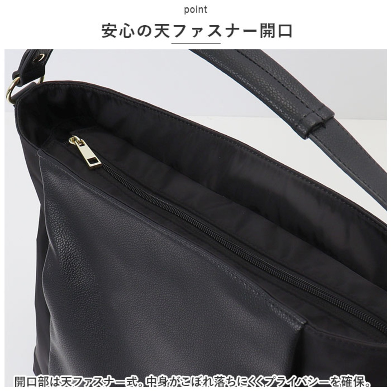 ・開口部は天ファスナー式。中身がこぼれ落ちにくくプライバシーを確保。