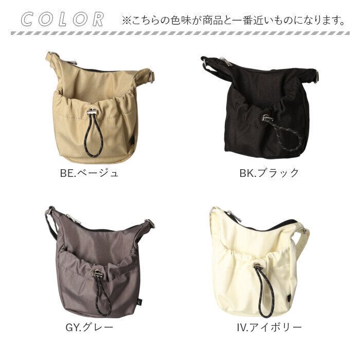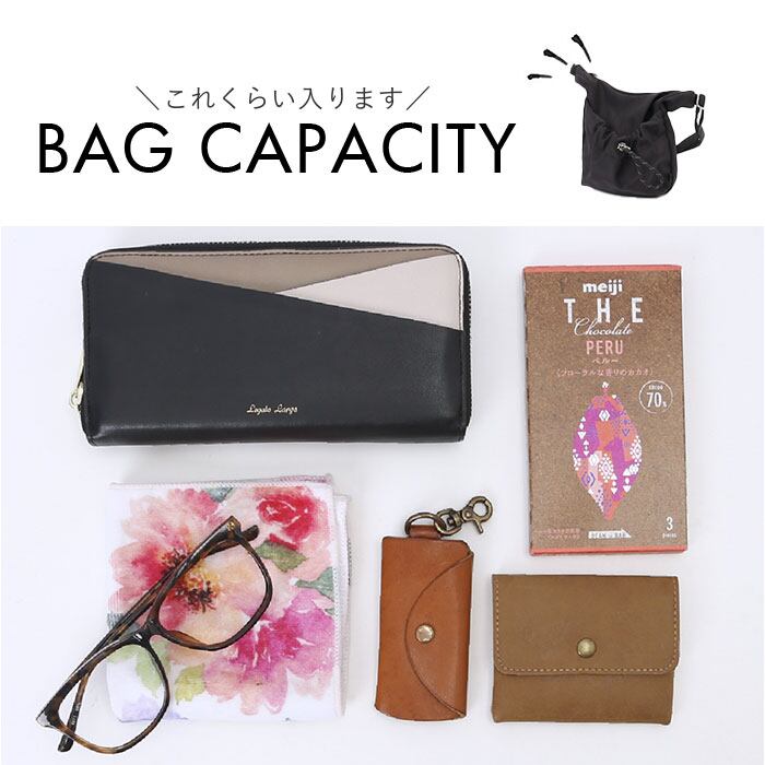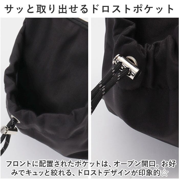 ・フロントに配置されたポケットは、オープン開口。お好みでキュッと絞れる、ドロストデザインが印象的☆