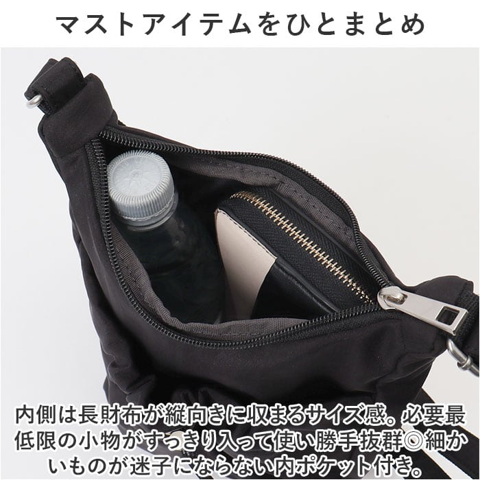 ・内側は長財布が縦向きに収まるサイズ感。必要最低限の小物がすっきり入って使い勝手抜群◎細かいものが迷子にならない内ポケット付き。