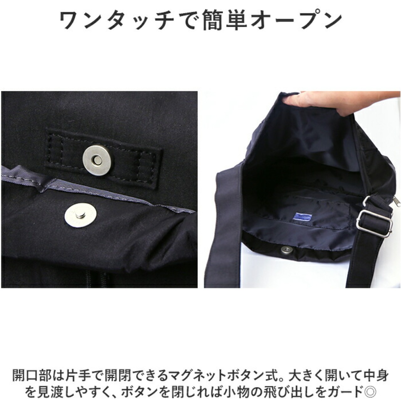 ・開口部は片手で開閉できるマグネットボタン式。大きく開いて中身を見渡しやすく、ボタンを閉じれば小物の飛び出しをガード◎