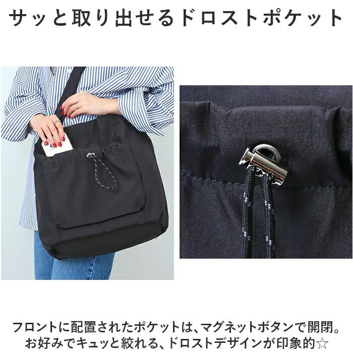 ・フロントに配置されたポケットは、マグネットボタンで開閉。お好みでキュッと絞れる、ドロストデザインが印象的☆