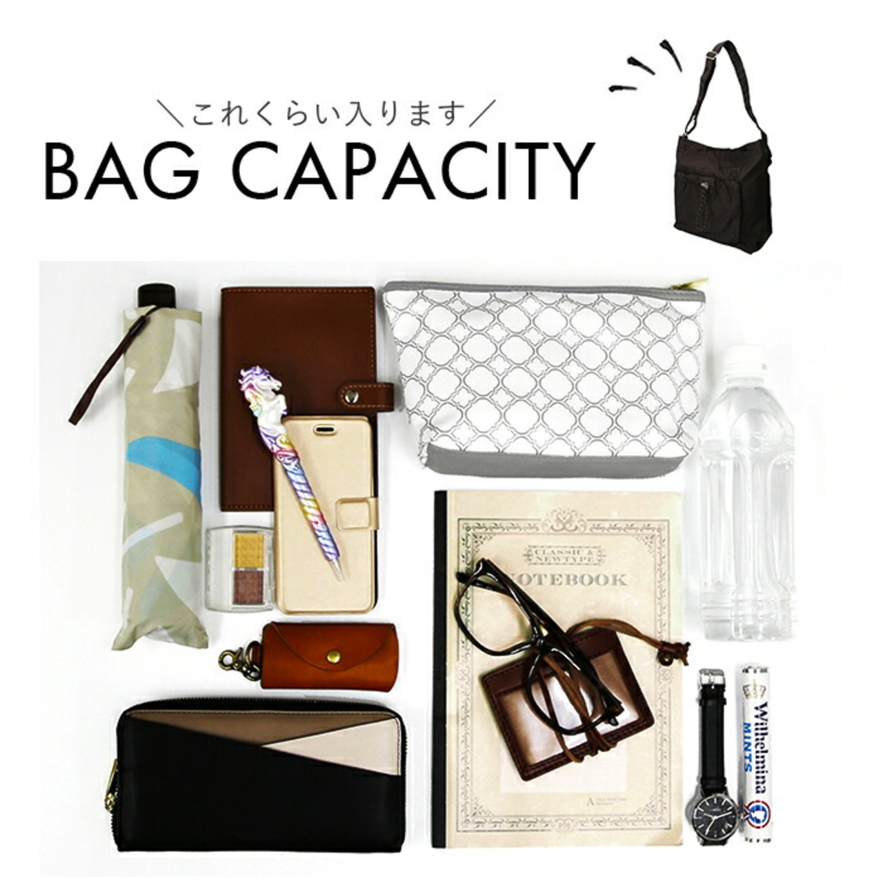 ・長さ調節可能なワンショルダータイプ。肩掛けも斜め掛けもできて、両手をふさがず移動もストレスフリー◎