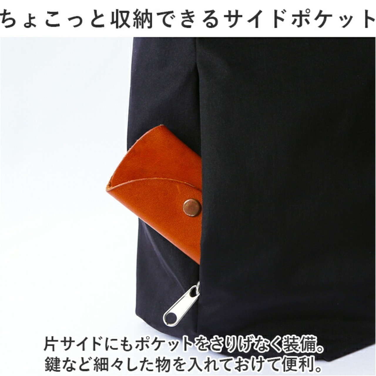 ・片サイドにもポケットをさりげなく装備。鍵など細々した物を入れておけて便利。
