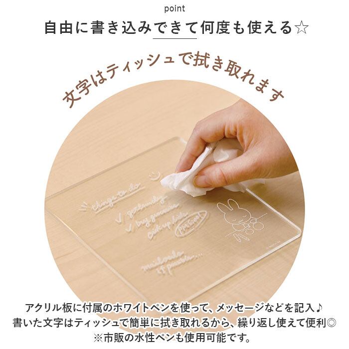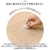 ・アクリル板に付属のホワイトペンを使って、メッセージなどを記入♪書いた文字はティッシュで簡単に拭き取れるから、繰り返し使えて便利◎(※市販の水性ペンも使用可能です。)