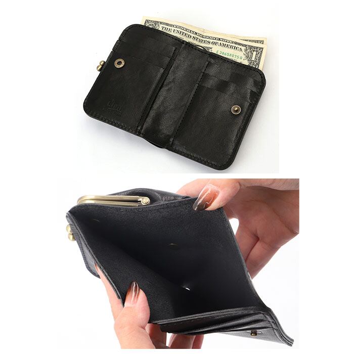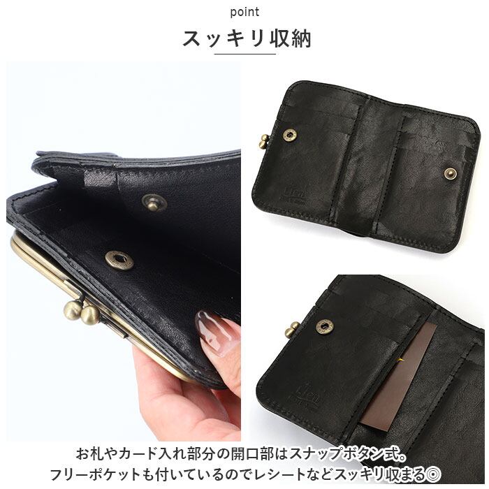 ・小銭入れ部分はがま口で大きく開くので取り出しやすく、小銭入れの中に仕切りを付けたことで、カード収納も可能に。