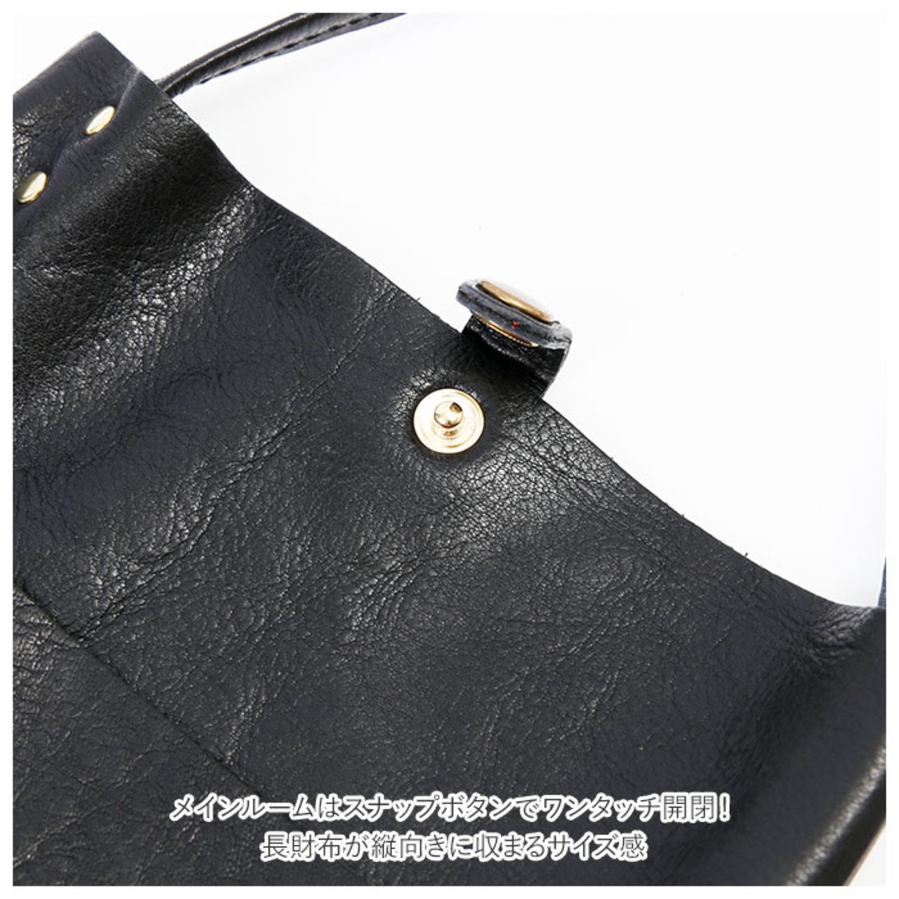 ・メインルームはスナップボタンでワンタッチ開閉!長財布が縦向きに収まるサイズ感。