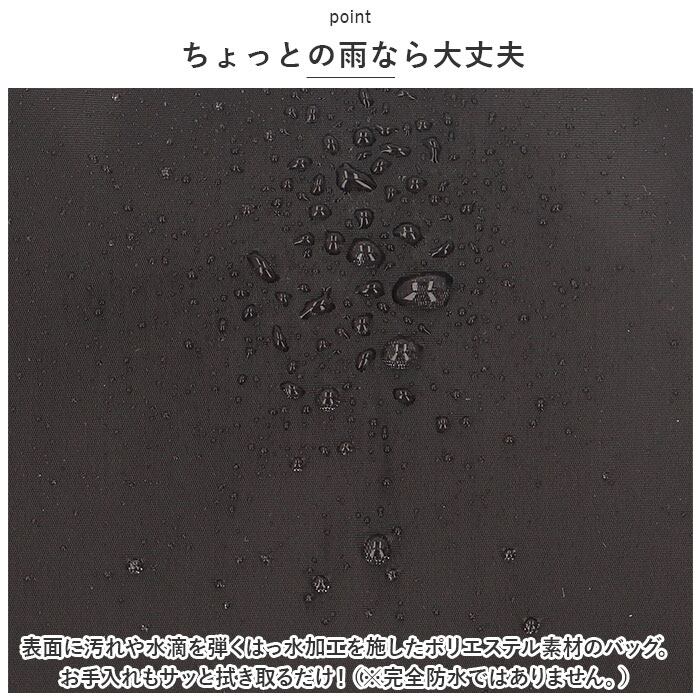 ・表面に汚れや水滴を弾くはっ水加工を施したポリエステル素材のバッグ。お手入れもサッと拭き取るだけ!(※完全防水ではありません。)