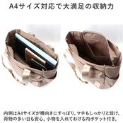 ・内側はA4サイズが横向きにすっぽり。マチもしっかりと設け、荷物の多い日も安心。小物を入れておける内ポケット付き。
