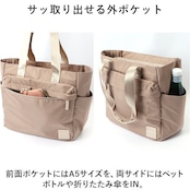 ・前面ポケットにはA5サイズを、両サイドにはペットボトルや折りたたみ傘をIN。
