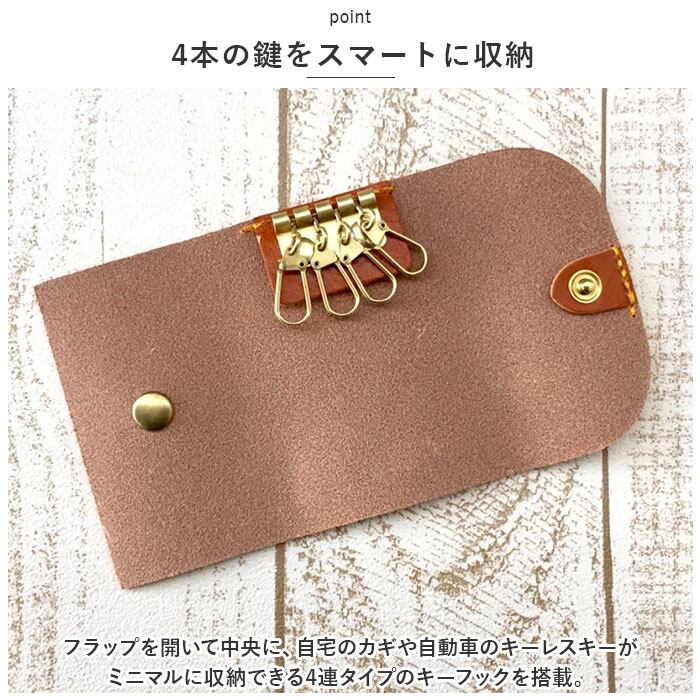・フラップを開いて中央に、自宅のカギや自動車のキーレスキーがミニマルに収納できる4連タイプのキーフックを搭載。