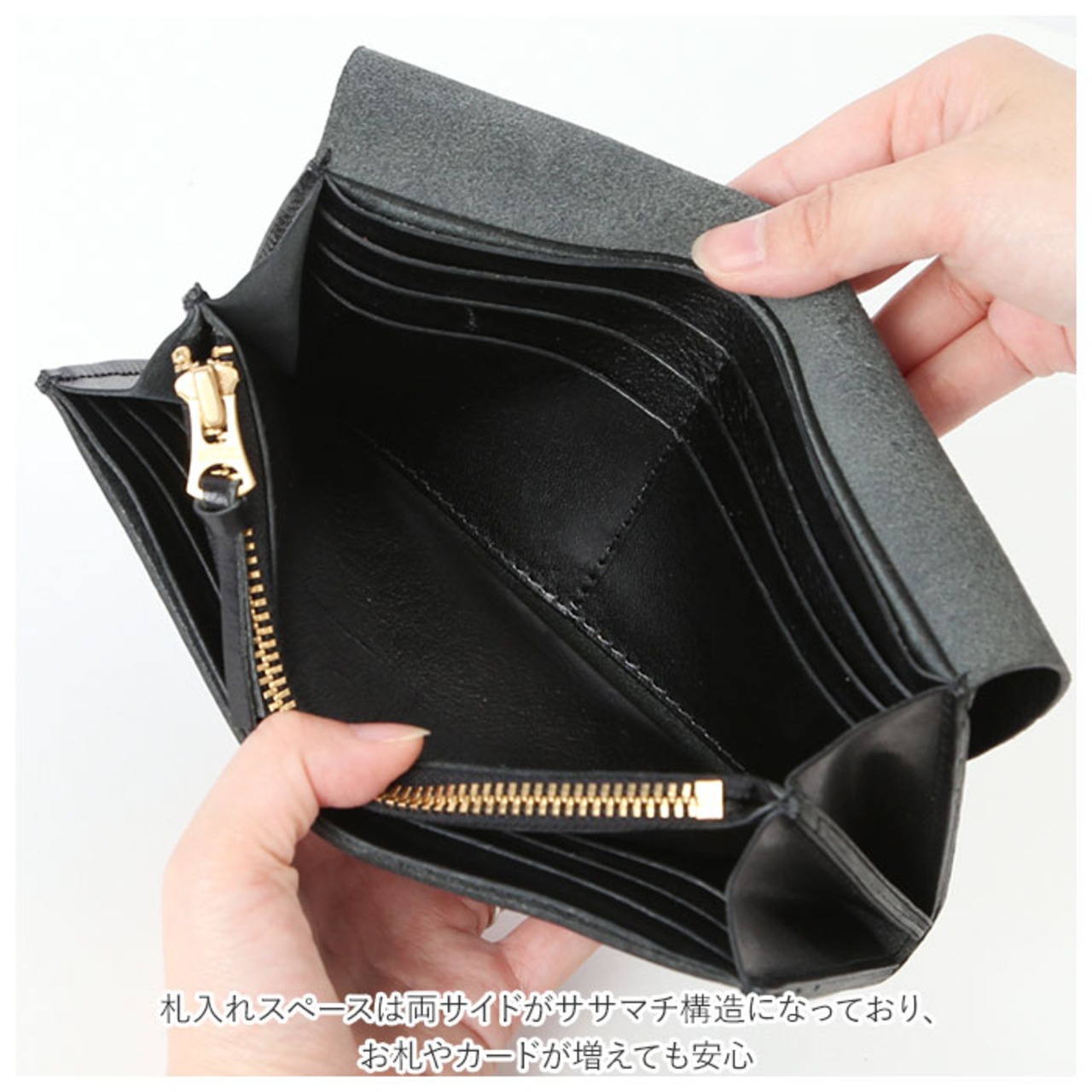 ・札入れスペースは両サイドがササマチ構造になっており、お札やカードが増えても安心。