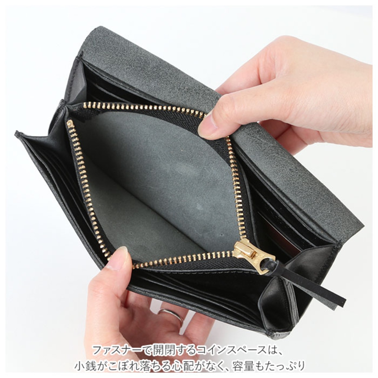 ・ファスナーで開閉するコインスペースは、小銭がこぼれ落ちる心配がなく、容量もたっぷり。