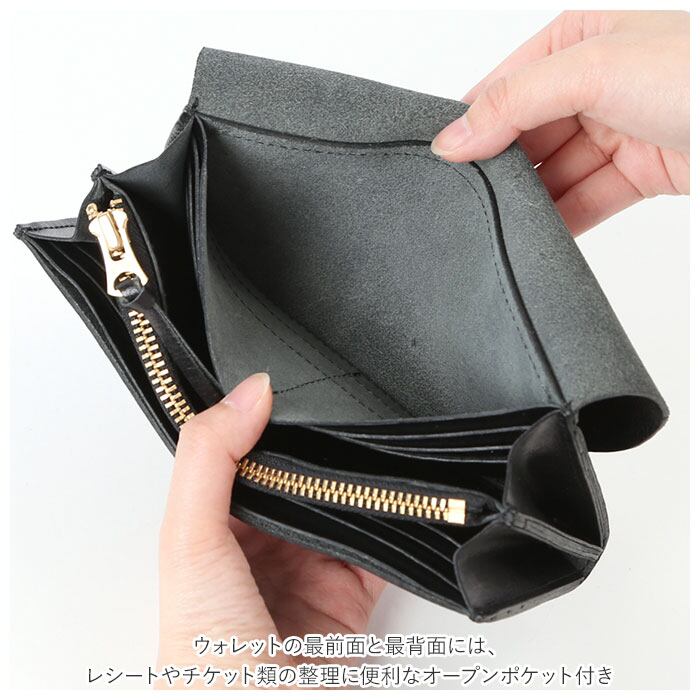 ・ウォレットの最前面と最背面には、レシートやチケット類の整理に便利なオープンポケット付き。