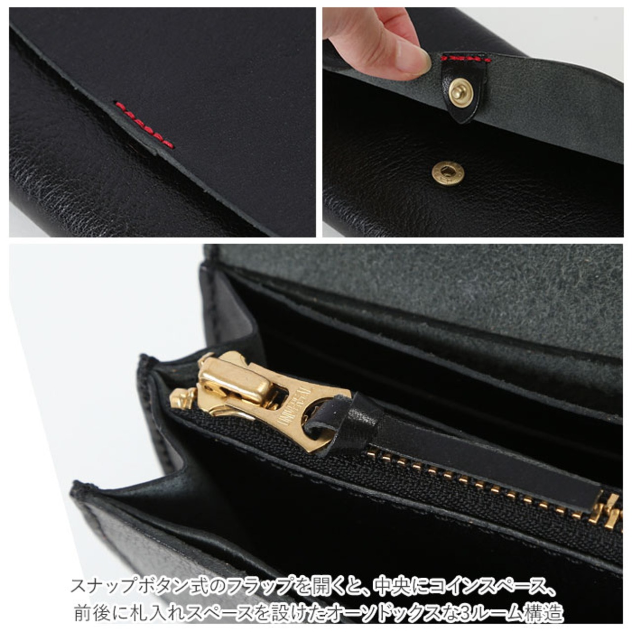 ・スナップボタン式のフラップを開くと、中央にコインスペース、前後に札入れスペースを設けたオーソドックスな3ルーム構造。