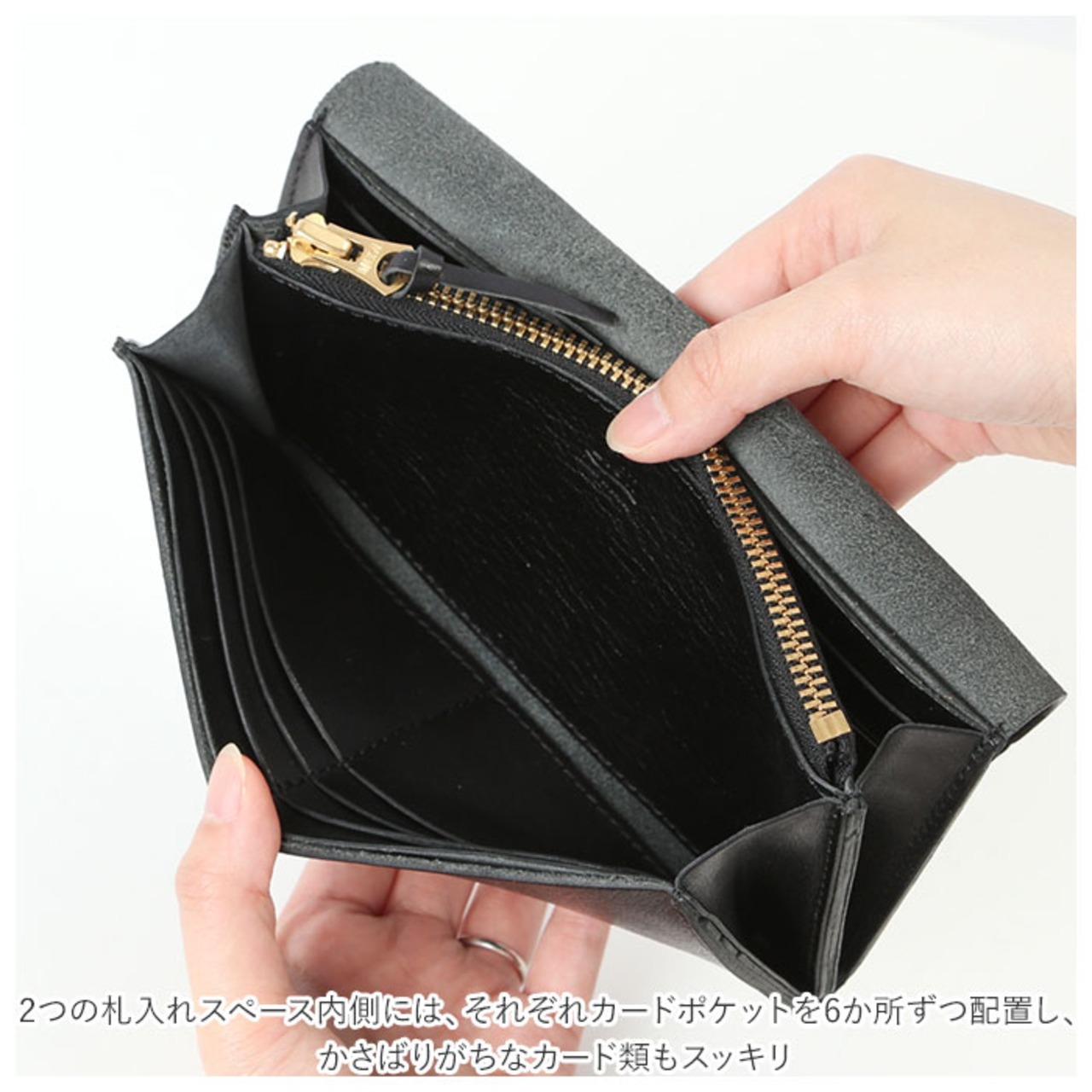 2つの札入れスペース内側には、それぞれカードポケットを6か所ずつ配置し、かさばりがちなカード類もスッキリ。