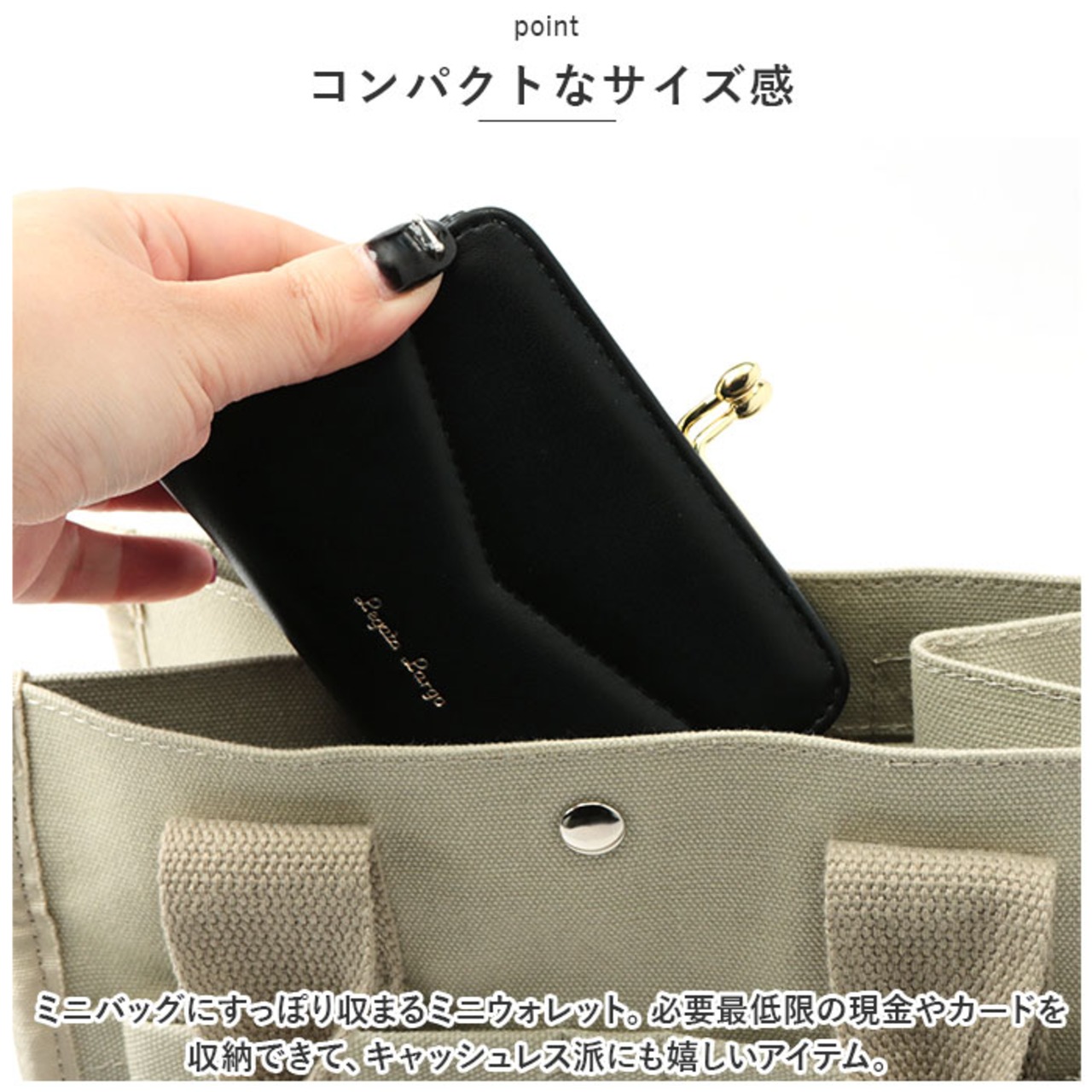 ・ミニバッグにすっぽり収まるミニウォレット。必要最低限の現金やカードを収納できて、キャッシュレス派にも嬉しいアイテム。