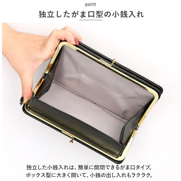 ・独立した小銭入れは、簡単に開閉できるがま口タイプ。ボックス型に大きく開いて、小銭の出し入れもラクラク。