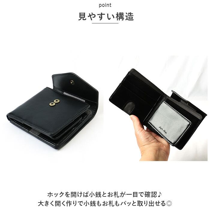 ・ホックを開けば小銭とお札が一目で確認♪大きく開く作りで小銭もお札もパッと取り出せる◎