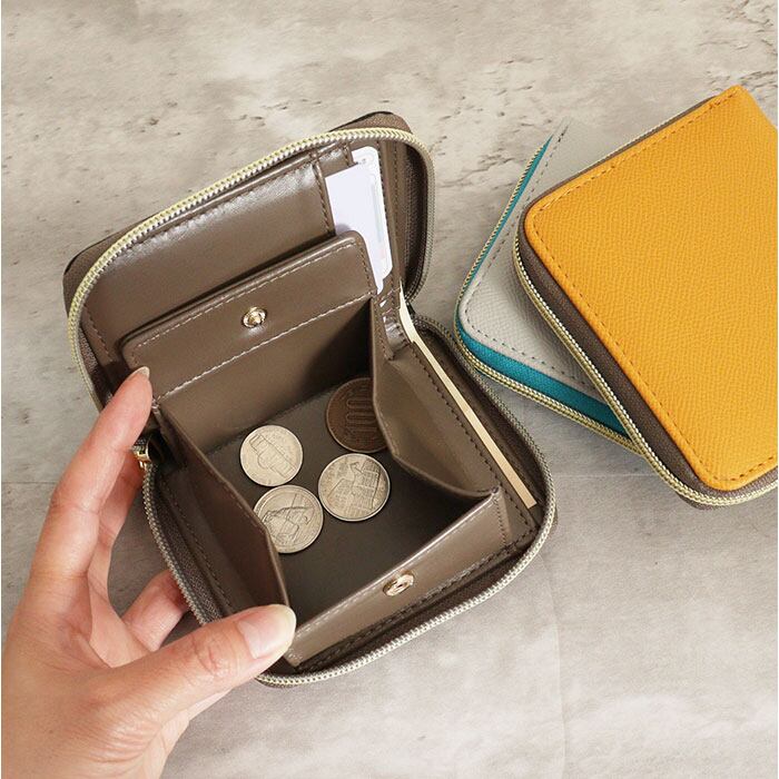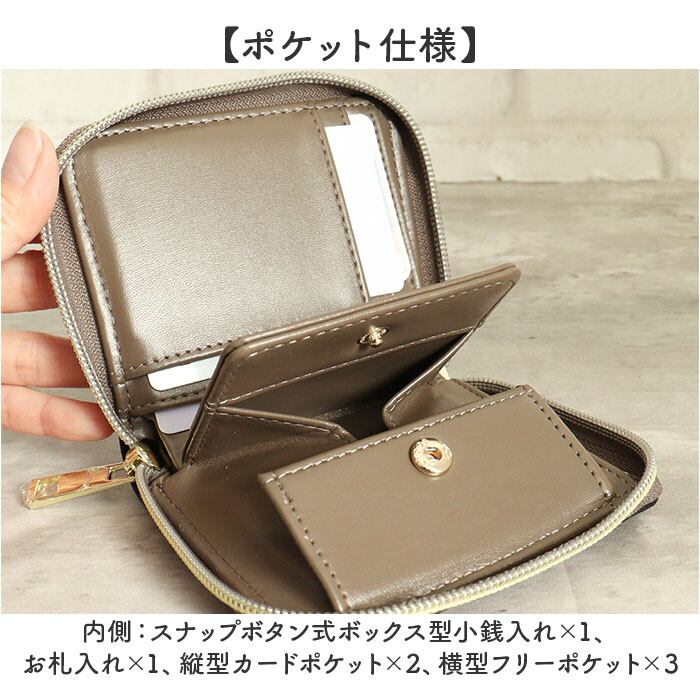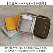 ・取り出しやすいボックス型の小銭入れの他、お札やカードを収納できるポケットを装備。