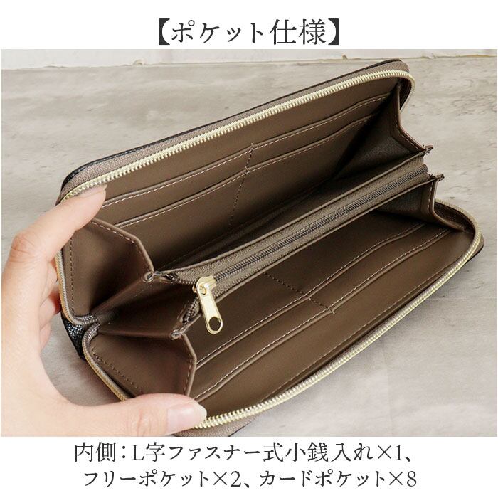 ・内側:L字ファスナー式小銭入れ×1、フリーポケット×2、カードポケット×8