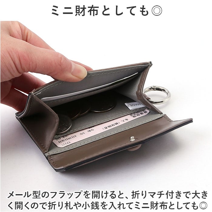 ・メール型のフラップを開けると、折りマチ付きで大きく開くので折り札や小銭を入れてミニ財布としても◎