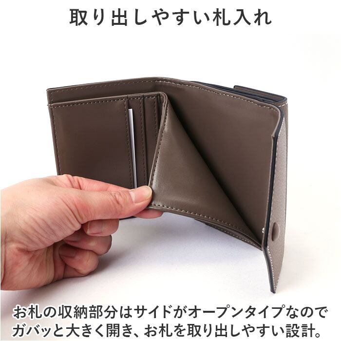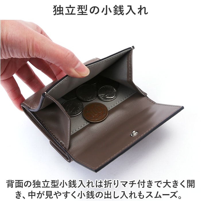 ・背面の独立型小銭入れは折りマチ付きで大きく開き、中が見やすく小銭の出し入れもスムーズ。