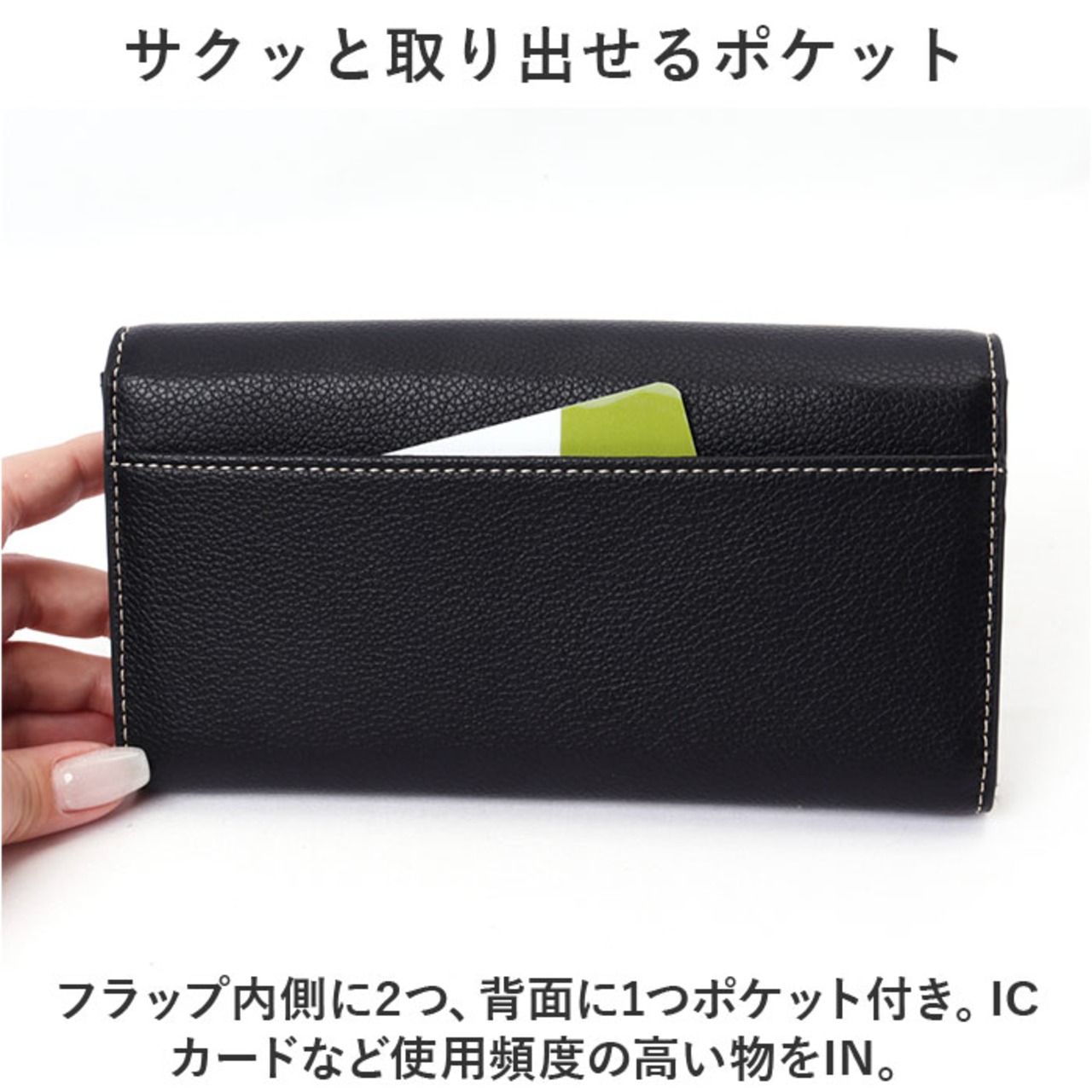 ・フラップ内側に2つ、背面に1つポケット付き。ICカードなど使用頻度の高い物をIN。