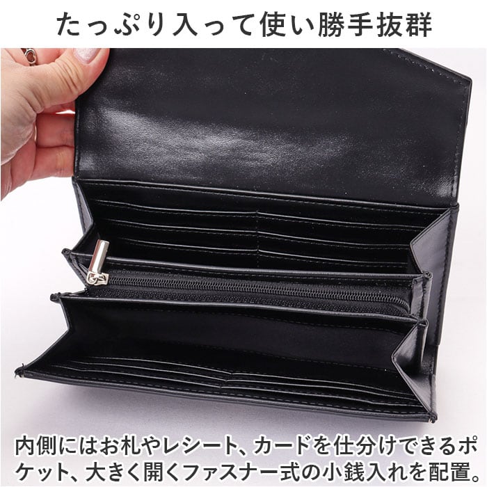 ・内側にはお札やレシート、カードを仕分けできるポケット、大きく開くファスナー式の小銭入れを配置。