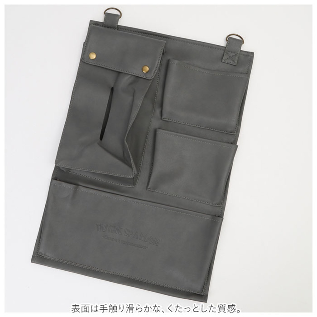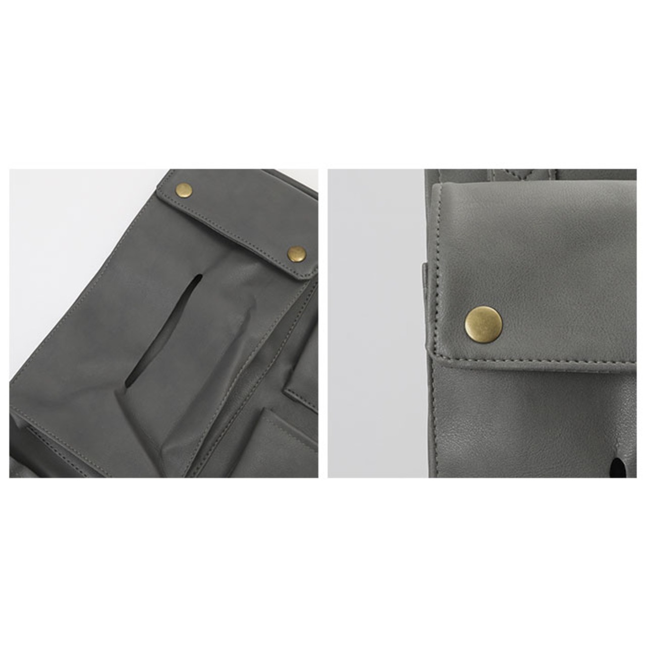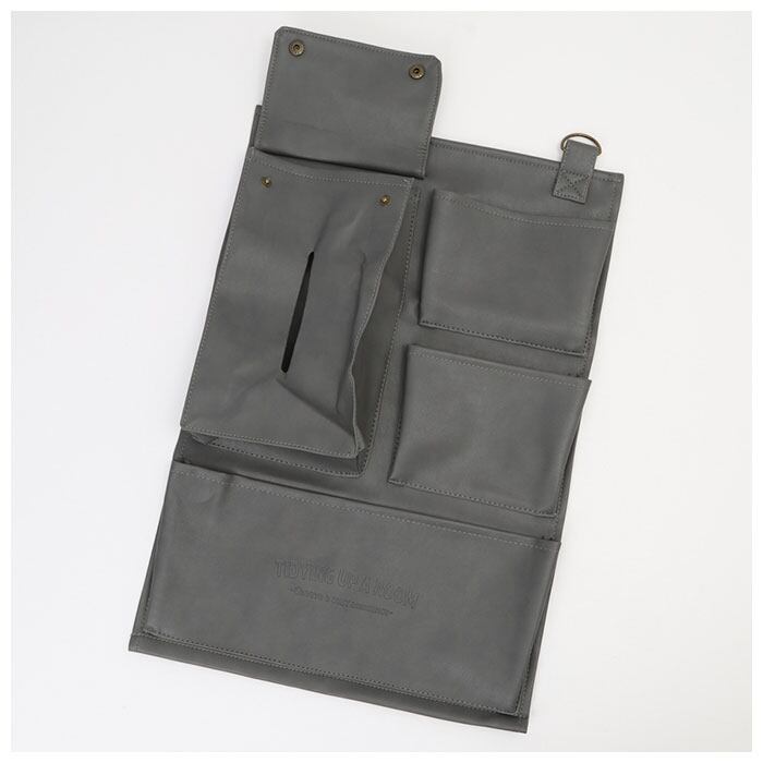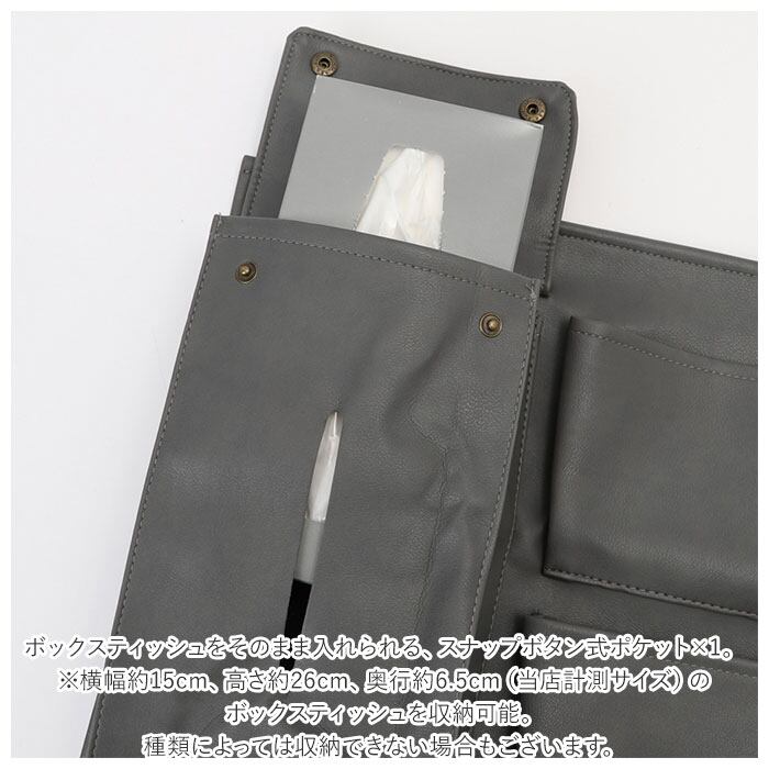 ・ボックスティッシュをそのまま入れられる、スナップボタン式ポケット×1。【※横幅約15cm、高さ約26cm、奥行約6.5cm(当店計測サイズ)のボックスティッシュを収納可能。種類によっては収納できない場合もございます。】