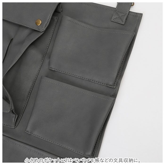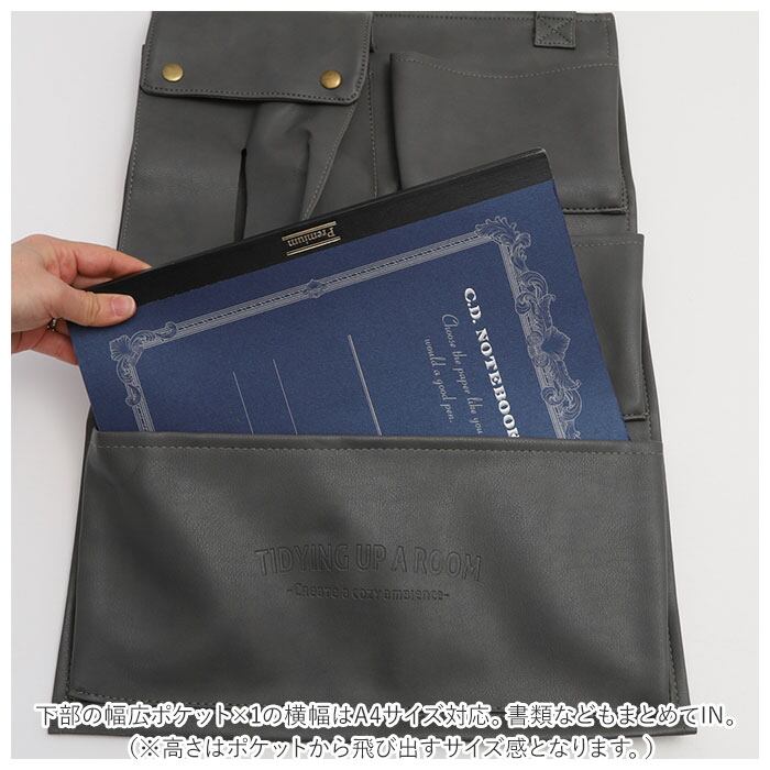 ・下部の幅広ポケット×1の横幅はA4サイズ対応。書類などもまとめてIN。(※高さはポケットから飛び出すサイズ感となります。)